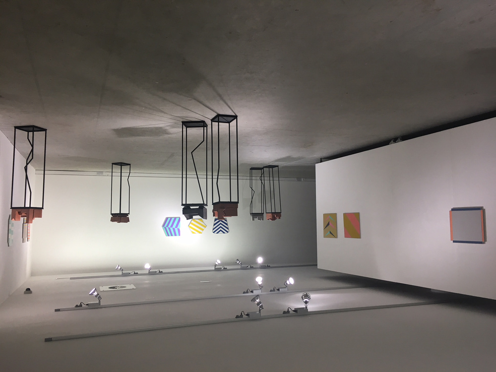 Callaghan takes the audience on a sensorial journey exploring the gap between form and its potentiality. For this purpose, the artist presents within the space two different types of microstructure designed to stimulate both the viewer’s intellect and their emotions. In the middle of the room, eight clay sculptures are displayed on minimal black plinths of varying shapes. The uneven and porous texture of the clay is carefully worked to create a uniform surface similar to that which would be achieved through a mechanical process of production. The architectural aspect of these sculptures makes them appear like scaled down models that are suggestive of certain structures: a room; a public square; a city. On the wall, twelve geometric paintings are on show. Made of wood, each piece is coloured differently, with combinations of intersecting parallel lines. By merging geometrical patterns and different chromatic ranges, these wall pieces are intended by the artist as an exploration into form and colour to create a new aesthetical singularity. A lo-fi sound installation permeates the exhibition space. With its phonographic imperfections and fluctuating trends, the music builds a dialogue with the rational and emotional stimuli engendered by both the clay sculptures and the wall pieces.